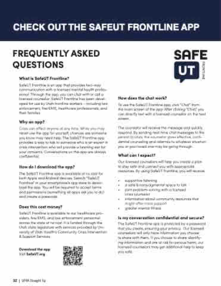 viders, fire/EMS, and law enforcement personnel SafeUT Frontline is available to our healthcare pro-