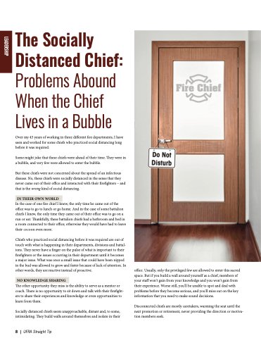 Chiefs who practiced social distancing before it was required are out of touch with what is happening in their departments, divisions and battal- ions. They never have a finger on the pulse of what is important to their firefighters or the issues occurring in their department until it becomes a major issue. What was once a small issue that could have been nipped in the bud was allowed to grow and fester because of lack of attention. In other words, they are reactive instead of proactive.
