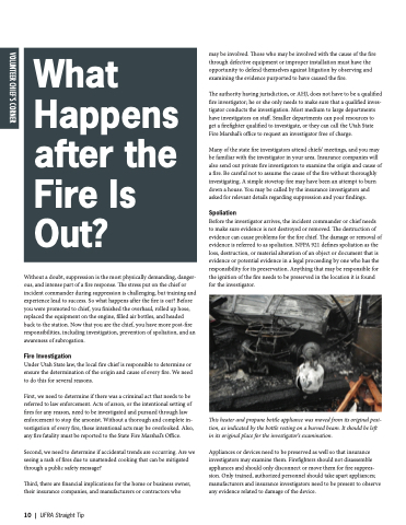Many of the state fire investigators attend chiefs’ meetings, and you may be familiar with the investigator in your area. Insurance companies will also send out private fire investigators to examine the origin and cause of a fire. Be careful not to assume the cause of the fire without thoroughly investigating. A simple stovetop fire may have been an attempt to burn down a house. You may be called by the insurance investigators and asked for relevant details regarding suppression and your findings.
