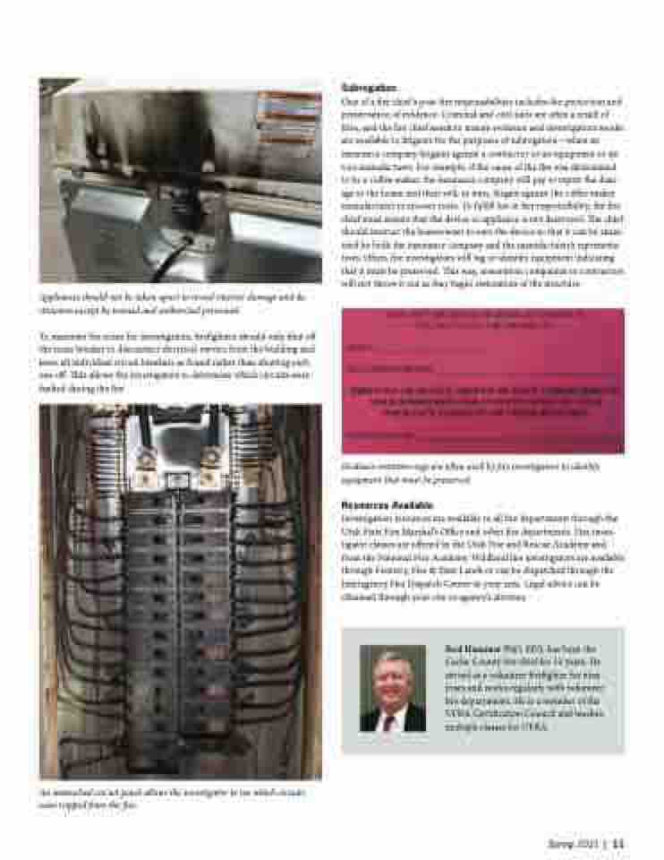 Investigation resources are available to all fire departments through the Utah State Fire Marshal’s Office and other fire departments. Fire inves- tigator classes are offered by the Utah Fire and Rescue Academy and from the National Fire Academy. Wildland fire investigators are available through Forestry, Fire & State Lands or can be dispatched through the Interagency Fire Dispatch Center in your area. Legal advice can be obtained through your city or agency’s attorney.