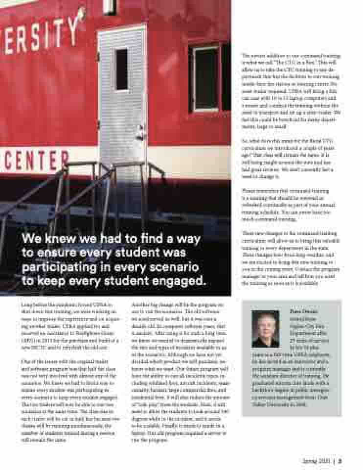 is ancient. After using it for such a long time, we knew we needed to dramatically expand the size and types of incidents available to us in the scenarios. Although we have not yet decided which product we will purchase, we know what we want. Our future program will have the ability to run all incidents types, in- cluding wildland fires, aircraft incidents, mass- casualty, hazmat, large commercial fires, and residential fires. It will also reduce the amount of “role play” from the students. Next, it will need to allow the students to look around 360 degrees while in the incident, and it needs