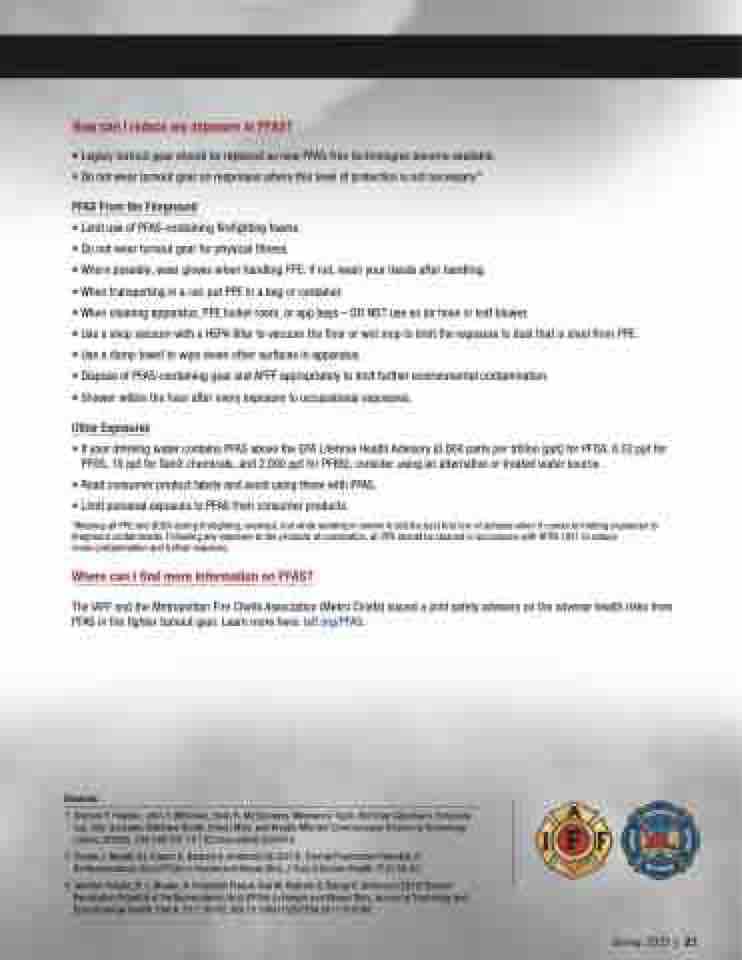 The IAFF and the Metropolitan Fire Chiefs Association (Metro Chiefs) issued a joint safety advisory on the adverse health risks from PFAS in fire fighter turnout gear. Learn more here: iaff.org/PFAS.